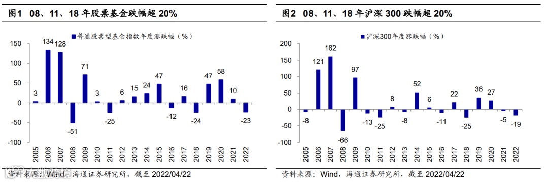 今年以来基金净值、沪深300的跌幅已经类似08、11、18年了。近期随着市场的回调进一步持续,部分投资者对后市的情绪也较为悲观,认为今年A股将迎来典型的熊市。其实从基金的角度来看,以普通股票型基金指数来衡量,今年(截至2022/04/22,下同)主动股票型基金净值已整体下跌23%,而历史上基金下跌超20%的年份仅有08(全年涨跌幅-51%)、11(-25%)、18年(-24%);此外从宽基指数的表现来看,沪深300今年全年跌幅也已达19%,而历史上沪深300跌超20%的年份也同样仅为08(全年涨跌幅-66%)、11(-25%)、18年(-25%),可见今年无论是基金还是指数在回撤幅度上确实已经接近典型的熊市。