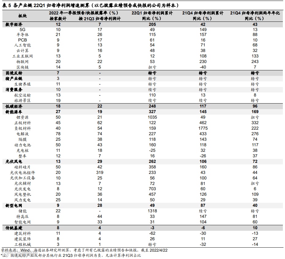 行业高频数据显示1-3月国内光伏发电新增装机容量同比增长62.3%,太阳能电池出口金额同比增长104%,数字经济领域,1-3月移动通信基站设备产量同比增长28%,相较21Q4的11.7%明显提升,电信主营业务收入增速为9.3%,相较21Q4的6.9%有所提升。一季报业绩方面,尽管当前披露率不高,但以573家已披露预告/快报的公司为样本,数字经济和低碳经济产业链的业绩继续保持快速增长的态势。数字经济整体22Q1归母净利润同比/21Q4归母净利两年年化累计同比为205%/43%;低碳经济整体22Q1归母净利润同比/21Q4归母净利两年年化累计同比为248%/96%,光伏风电业绩增速提升幅度较大。