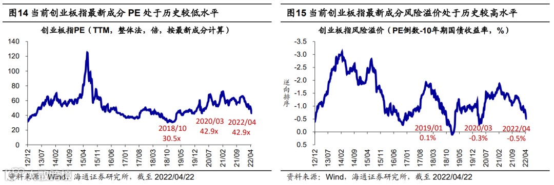 从基金重仓股角度看成长股的估值已经来到历史较低的区间,而从指数层面来看成长风格的回调同样显著。截至22/04/22,按最新成分来计算,创业板指 PE(TTM,下同)为42.9倍,处13年以来从低到高25%分位;风险溢价率(1/创业板指PE-十年期国债利率,下同)为-0.5%,处13年以来从高到低9%分位。而20年3月创业板指PE同样为42.9倍(风险溢价率为-0.3%)。PE和风险溢价率角度而言,当前创业板指最新成分股的整体性价比略好于20年3月疫情底时了。