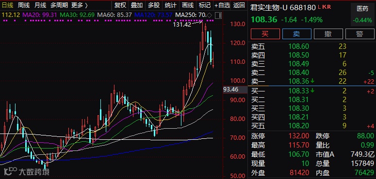 君实生物近一段时间股价走势较为强势,但最近几个交易日有所回调。