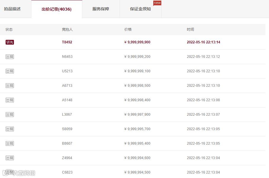 梳理竞拍记录:5月12日7时05分,有买家首次出价3999万;5月16日下午3点半左右,有人开始加价;5月16日晚上21时13分,价格突然从5258万飙升至52577.79万元,此后拍卖价格一路上涨。到5月16日22时13分14秒,价格已被拍至99.999999亿元。