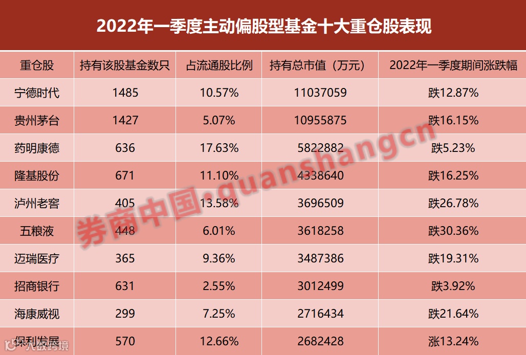 天相数据显示,2022 年一季度,公募基金(主动偏股型基金)持有总市值前三的公司为宁德时代、贵州茅台和药明康德。基金经理仍偏爱贵州茅台和宁德时代,持有这些股票的基金只数均达到 1400 以上。除了保利发展外,一季度的十大基金重仓股 在报告期内均有所下跌,其中五粮液下跌最为严重,跌幅高达 30.36%, 泸州老窖跌幅第二,下跌 26.78%。2022 年 4 月以来重仓股 TOP10 整体表现较弱,其中宁德时代与隆基股份跌幅 分别为 18.93%、14.12%。