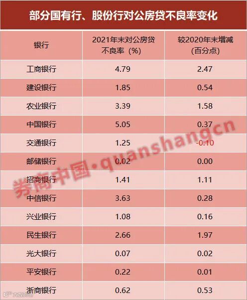 与此同时,受个别房企波及,2021年末,国、股银行房地产业公司贷款不良率普遍抬头。其中,工商银行、民生银行对公涉房资产不良率更是成倍增长。
