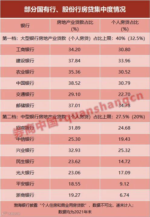 2021年是房地产贷款集中度分档考核制度落地的第一年。券商中国记者统计发现,截至年末,已披露可比数据的国、股银行中,有4家银行涉房贷款占比超出监管设限。其中,建设银行、邮储银行个人住房贷款占比超过32.5%的上限;股份行中,招商银行、兴业银行房地产行业贷款和个人住房贷款占比均超上限。