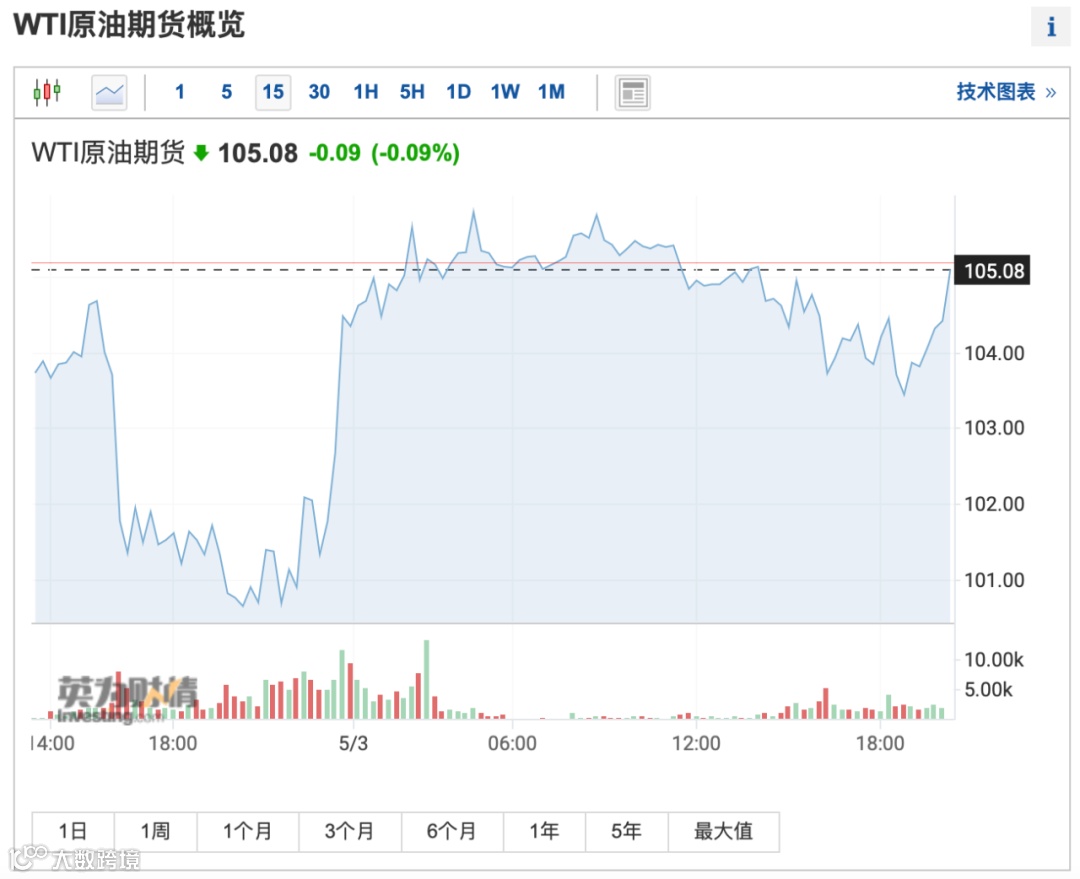 受禁运石油消息影响,原油周一盘中强劲反弹,抹平逾4%的日内跌幅并收涨。截至目前,布油报106.68美元/桶,WTI原油超105美元/桶。