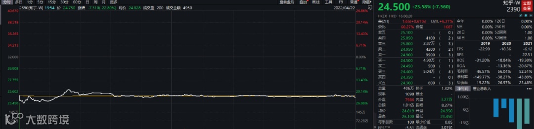 据了解,知乎港股的发行价为32.06港元,开盘即破发,低开22.18%,报24.95港元。截至4月22日,知乎收报24.5港元,跌23.58%,市值约80亿港元。