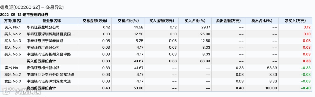 即将退市的A股公司德奥退近日深刻感受到了门可罗雀。在最近的几个交易日,公司成交额都在万元以下。5月12日全天成交4008元,龙虎榜上有几个机构单日买入仅有0.03万元。