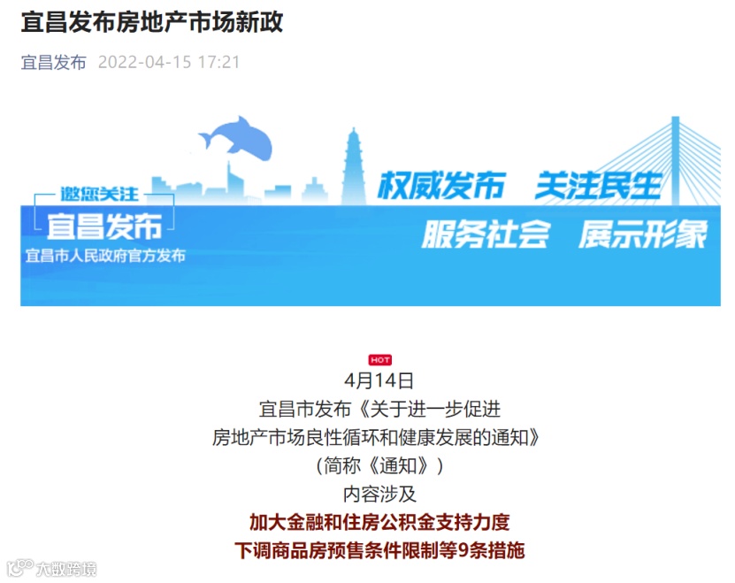 4月15日,券商中国记者从宜昌市政府官微“宜昌发布”了解到,宜昌市发布了《关于进一步促进房地产市场良性循环和健康发展的通知》,内容涉及放松限贷、取消限售等9条措施。