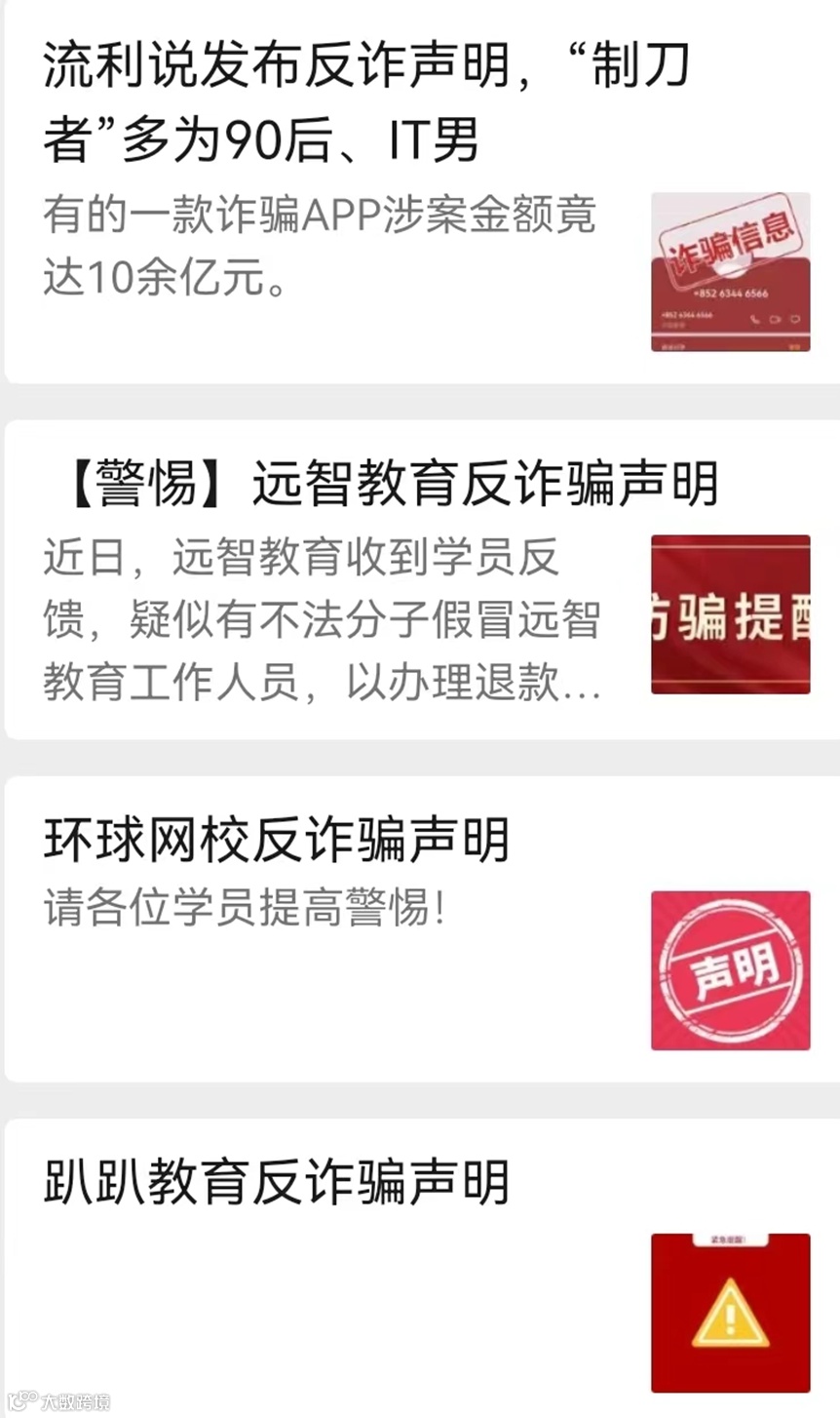 此外,优路教育、远智教育、高顿教育等教培机构近期也纷纷发布声明,提醒学员注意识别,谨防被骗。还有多地警方也发布了宣传视频,提醒防范打着退费旗号的诈骗分子。