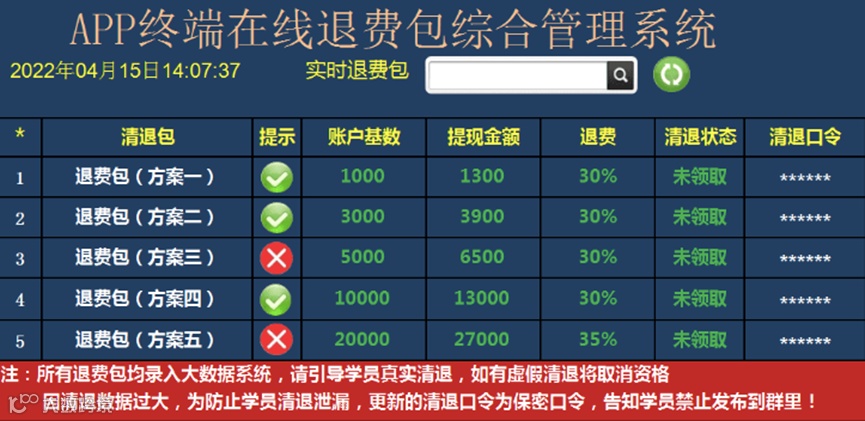 目前已和港泰创投交易所达成合作协议,需要退费的学员必须在交易所注入一笔退费包基数,开通交易所退费账户,才能进行学费退款。