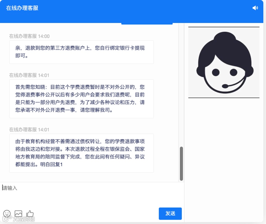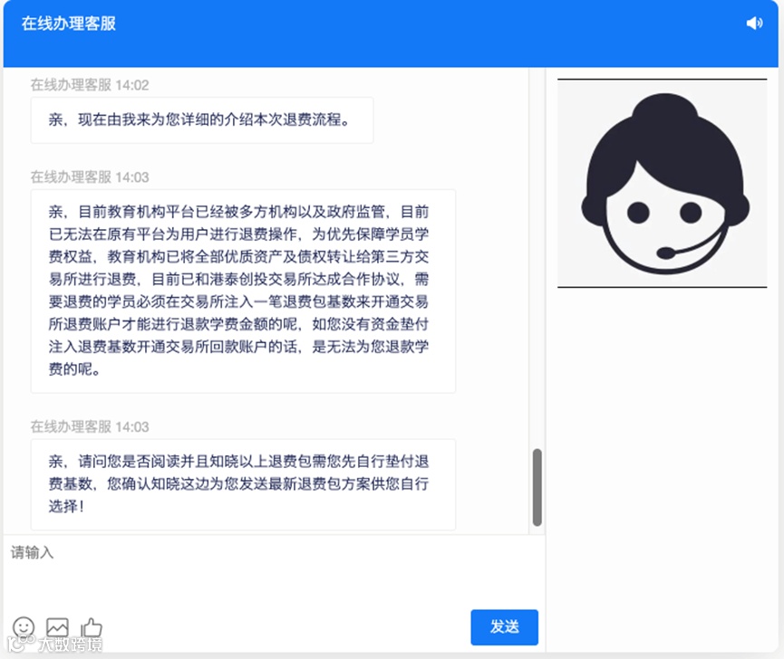 客服声称,由于教育机构平台已被多方机构及政府监管,目前已无法在原有平台为用户进行退费操作,为优先保障学员学费权益,教育机构已将全部优质资产及债权,转让给第三方交易所进行退费。
