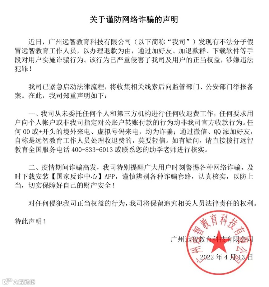 由于诈骗手段复杂,更新速度快,近期已有多家家培机构发布声明,提醒学员防范诈骗。
