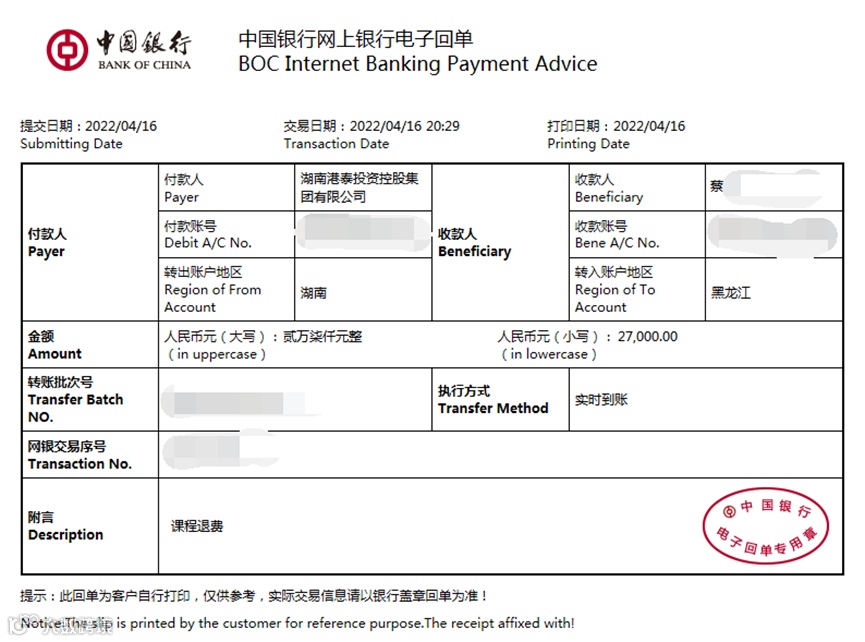回单付款人均为湖南港泰投资控股集团有限公司,收款人均为学员姓名,附言一栏则写着“课程退费”。这些电子回单涉及金额低者千余元,高者可达数万元。