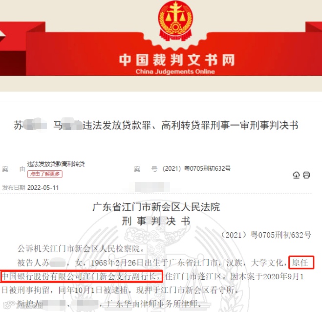 根据裁判文书网日前公布的判决书显示,中行江门新会支行原副行长苏某某,为了谋取非法利益,伙同他人通过虚假贷款资料累计套取中行信贷资金超千万元,并最高以年利率24%的高息转贷给他人进行牟利,最终被判处有期徒刑2年3个月。