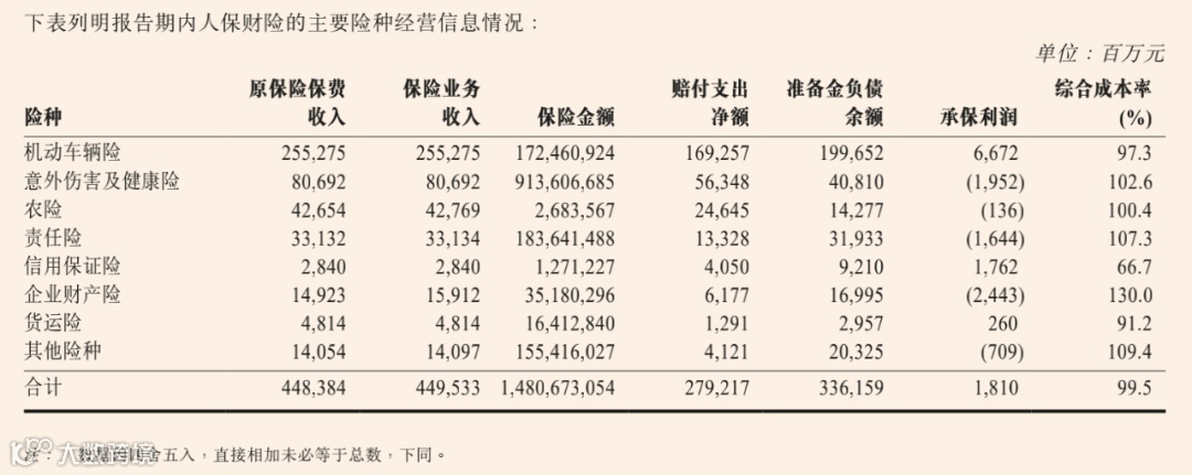 车险的承保利润为66.72亿元,同比减少24.3%。其综合成本率为97.3%,同比上升0.8个百分点。由于车均保费下降、赔付责任增加以及7·20河南暴雨等因素影响,车险赔付率为70.1%,同比上升12.1个百分点。