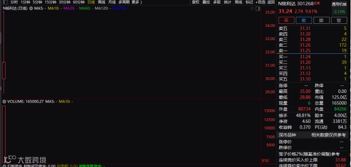 铭利达(301268.SZ)今天上午盘中一度达到35元,较发行价上涨超过两成,若按此价格计算,中一签新股浮盈超过3000元。