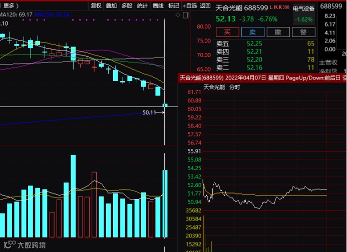 市值千亿元的光伏龙头天合光能今天上午盘中一度跌逾10%,后跌幅有所收窄。
