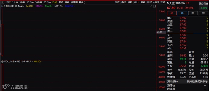 行情数据显示,天益医疗(301097.SZ)今天上午盘中一度达到76.8元,较发行价上涨46.65%,若按此价格计算,中一签新股浮盈超过1.2万元。