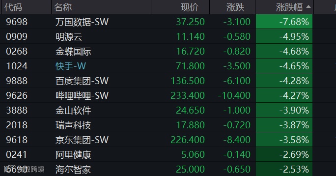 恒生科技指数跌幅稍大,该指数成份股中,万国数据-SW、金蝶国际、明源云等跌幅居前。