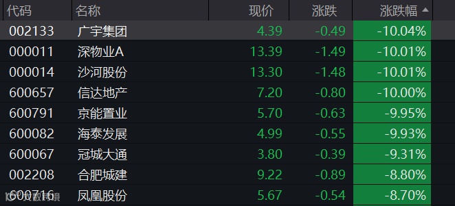 行业板块方面,在连续多日上涨后,地产板块上午陷入调整,板块盘中跌幅在3%左右。广宇集团、深物业A、沙河股份、信达地产、京能置业等多股盘中跌停。地产龙头抗跌,万科A上午仅跌1.04%,保利发展跌2.57%。