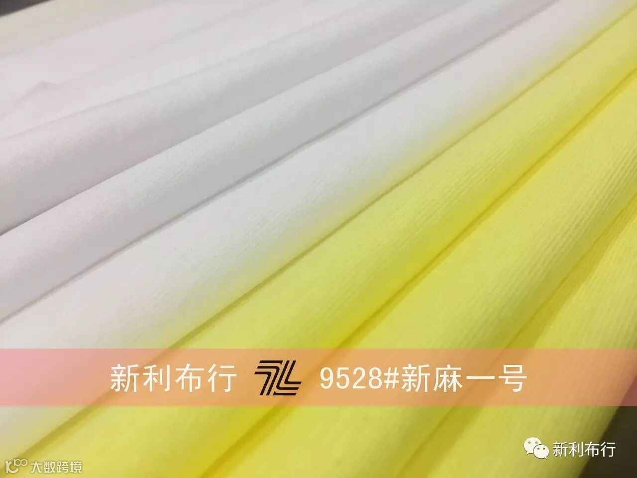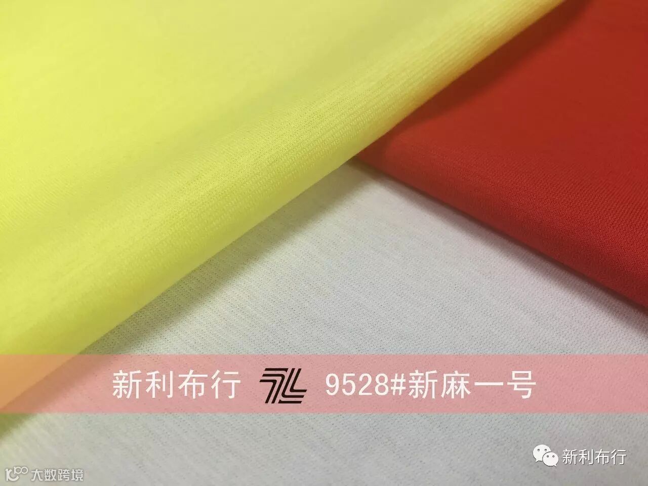 9528#新麻一号,幅宽170cm,克重140g。布面纹路若隐若现,面料有光泽,带有轻许麻感,同时手感如丝般顺滑舒适,透气性、柔软性好。新麻一号既具有吸汗透气、柔软、防敏感等优点,还有易清洗、不易起毛球、保湿耐热等特性。