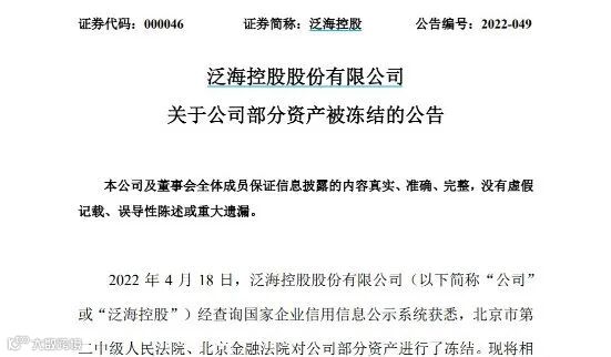 4月18日,泛海控股公告称,经查询国家企业信用信息公示系统,北京市第二中级人民法院、北京金融法院对公司部分资产进行了冻结,冻结期限均为三年。