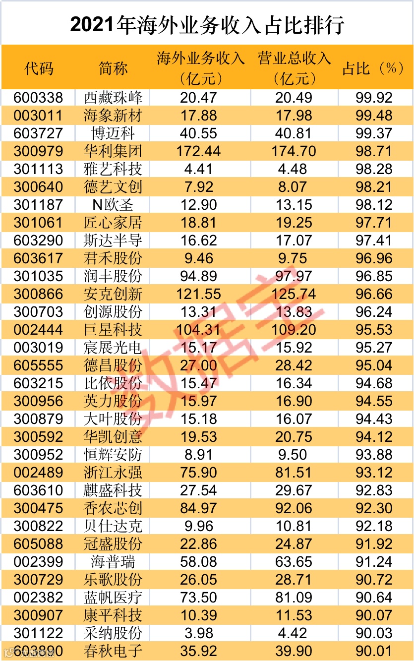 以海外业务收入占总营收比看,220多家公司海外营收占比超50%,32家公司占比超90%。西藏珠峰、海象新材、博迈科海外业务收入占比超过99%,华利集团、雅艺科技、德艺文创等占比超过98%。以西藏珠峰为例,公司去年20.49亿元,其中海外业务收入20.47亿元。