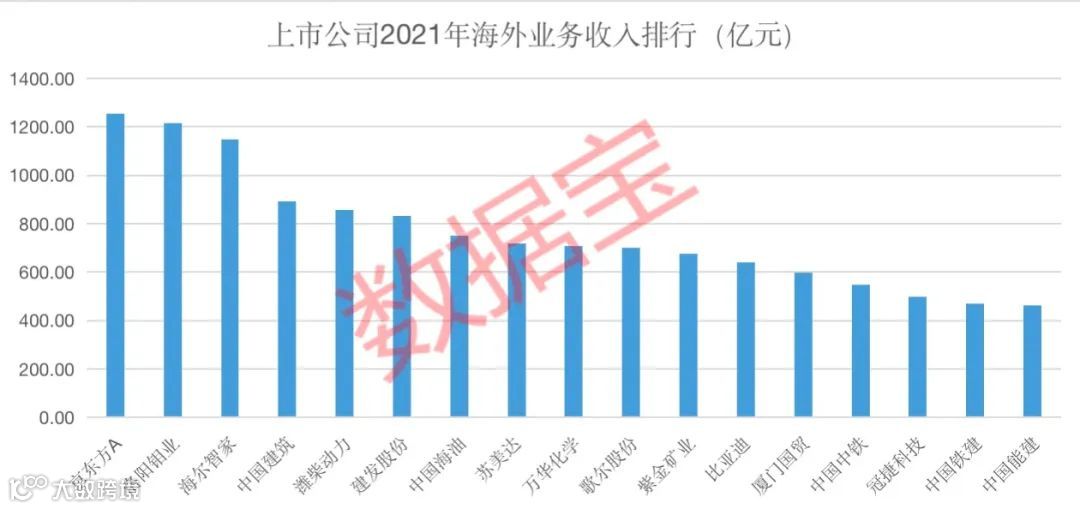 从A股来看,证券时报·数据宝统计,已披露2021年年报的公司中,有1500多家公司有海外业务收入,合计收入总额3.74万亿元,其中有400多家公司海外收入超过10亿元。京东方A、洛阳钼业、海尔智家三家公司海外业务收入超过千亿元。中国建筑、潍柴动力、建发股份、中国海油等74家公司海外业务收入超过百亿元。