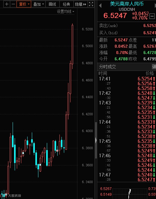近期,随着美联储加息预期增强,人民币对美元汇率快速走低。近四个交易日,离岸人民币四连跌,连续跌破6.45、6.46、6.47、6.48、6.49的整数关口,并于周五突破6.5的大关,最低跌至6.5267。近四个交易日,离岸人民币兑美元贬值超过1400个基点。四天跌幅超过2.2%,同时创下自去年7月以来新低。