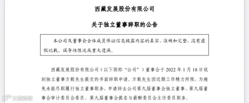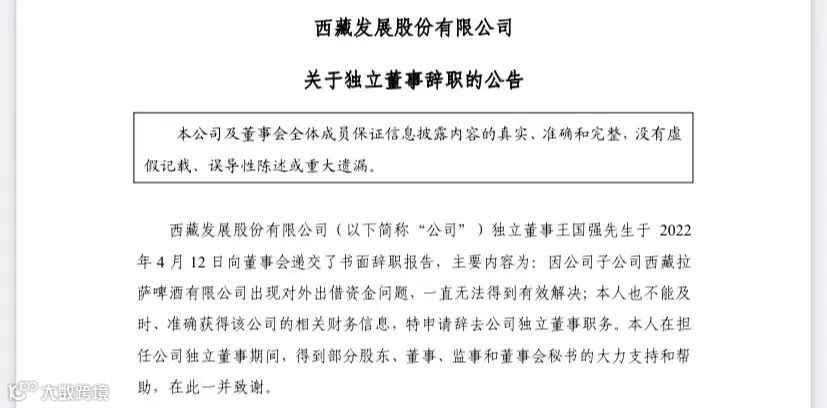 4月13日晚间,*ST西发公告称,公司独立董事王国强于4月12日向董事会递交了书面辞职报告,主要内容为:因公司子公司西藏拉萨啤酒有限公司出现对外出借资金问题,一直无法得到有效解决;本人也不能及时、准确获得该公司的相关财务信息,特申请辞去公司独立董事职务。