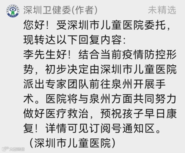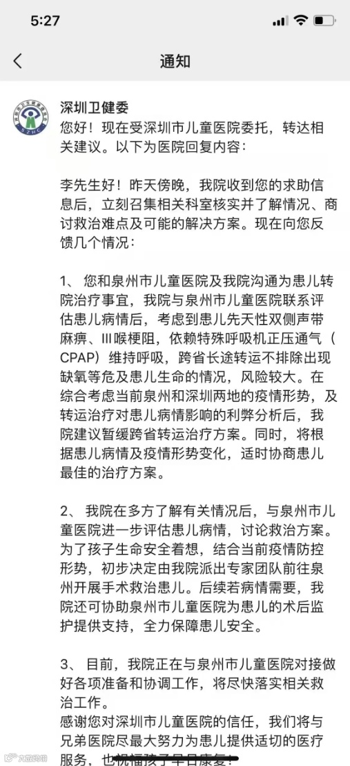 “感谢深圳卫健委、泉州卫健委、深圳儿童医院、泉州儿童医院,感谢泉州人民,感谢深圳人民,感谢所有关心,背后默默付出的大家。谢谢大家。病毒无情,人间有爱,希望孩子早日康复,希望好人一生平安。”
