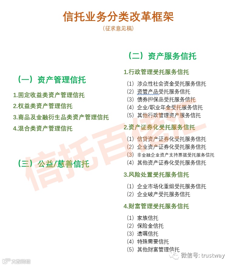 根据《信托业务分类征求意见稿》,信托业务将被划分为资产管理信托、资产服务信托、公益/慈善信托3大类,其中,资产管理信托项下有固定收益类产管理信托、权益类资产管理信托、商品及金融衍生品类资产管理信托与混合类资产管理信托等4项分类;资产服务信托项有行政管理受托服务信托、资产证券化受托服务信托、风险处置受托服务信托和财富管理受托服务信托等4项分类,且这4项分类下仍各有细项分类。