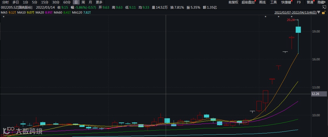 不过这一幕还是在昨日的A股市场发生了。在此前7个交易日收获6个涨停后,国统股份早盘再次拉升涨停,但随后炸板,持续震荡回落,接近收盘期间,国统股份股价跌停,上演“天地板”,但封跌停后不久,国统股份股价又近乎直线拉升,直接触及涨停,上演“地天板”。随后,股价又持续宽幅震荡,最终收盘涨2.45%,换手率达到58.95%。