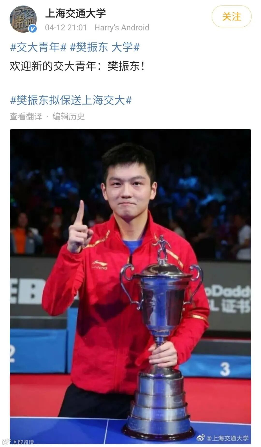 昨晚(12日),上海交通大学发布微博称:“欢迎新的交大青年:樊振东!”