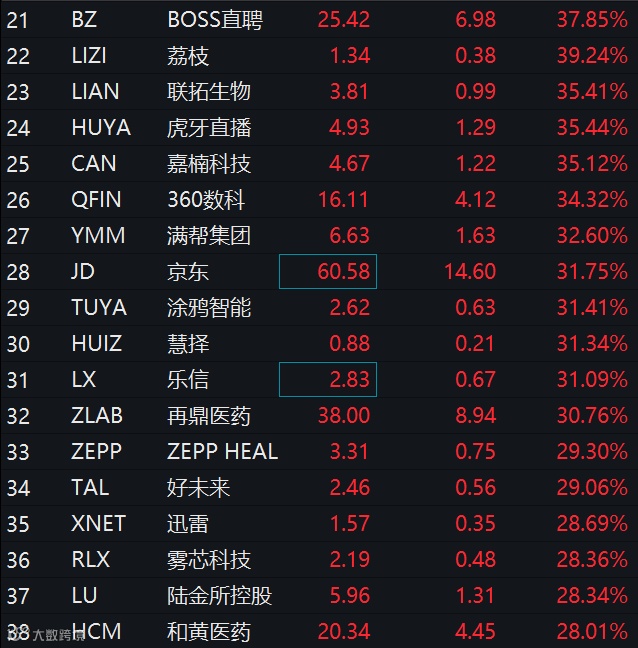 中国资产方面,富时A50指数期货上涨逾2%,纳斯达克金龙中国指数涨超22%。个股方面,截至23:30,房多多涨超102%,金山云涨超80%,贝壳涨逾60%,知乎涨超56%,爱奇艺涨近50%,拼多多涨超45%,滴滴出行涨超44%,哔哩哔哩涨超40%,京东、360数科等涨超30%,理想汽车、小鹏汽车、携程网等涨超27%,腾讯音乐、拜读、老虎证券、富途控股等涨超25%,阿里巴巴、蔚来、微博涨超20%。