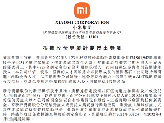 时隔大半年后,小米又启动了新一批股权激励。3月24日,小米集团公告称,董事会于2022年3月23日根据股份奖励计划奖励合共1.749亿股小米股份予4931名选定参与者。选定参与者为包含新十年创业者计划第二期入选人士在内的优秀员工,其中4929名选定参与者为非关连承授人,而两名选定参与者则为关连承授人。