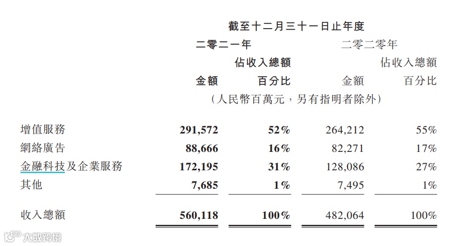 具体来看收入板块,增值服务收入2916亿元、金融科技及企业服务1722亿元、网络广告887亿元,分别占营收比重52%、31%和16%。