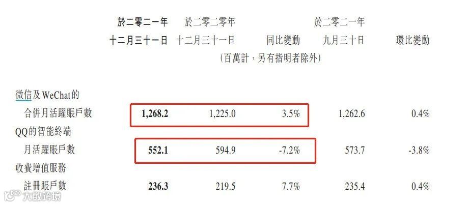 数据显示,微信及WeChat月活账户数12.68亿,同比增长3.5%,环比季度增长0.4%;QQ的月活账户数5.52亿,同比下降7.2%,环比下降3.8%。