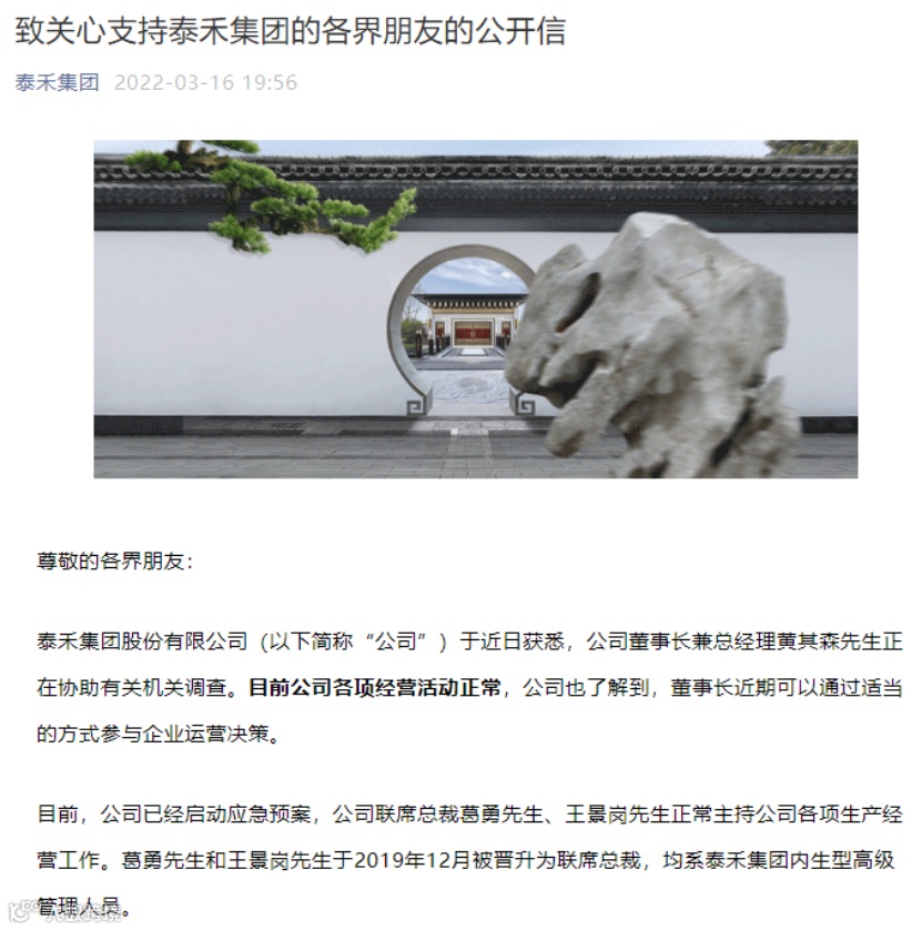 当晚,泰禾集团还在其官方微信上发布公开信称,董事长黄其森近期可以通过适当的方式参与企业运营决策。目前,公司已经召开了管理骨干人员会议。骨干人员情绪稳定,均表示将在现有管理团队带领下恪尽职守、努力工作。