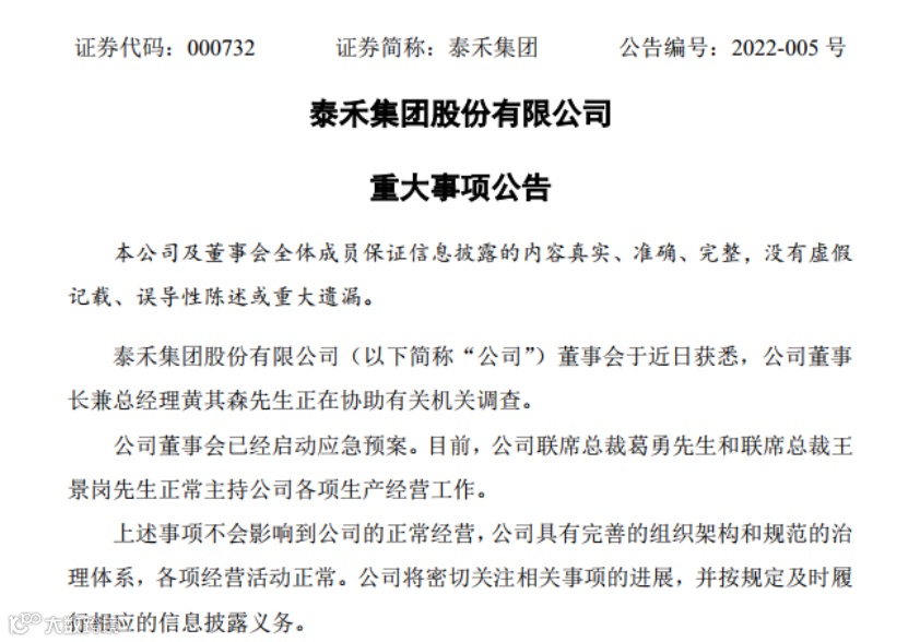 3月16日晚间,房地产企业泰禾集团发布公告称,董事长兼总经理黄其森正在协助有关机关调查。公司董事会已经启动应急预案。目前,公司联席总裁葛勇和联席总裁王景岗正常主持公司各项生产经营工作。