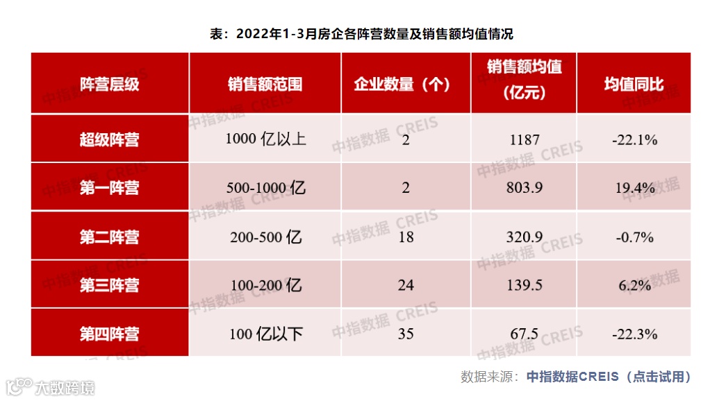 中指研究院的数据也显示,1-3月,TOP100房企销售额均值为162.6亿元,同比下降47.2%;其中销售额超千亿房企2家,较去年同期减少3家;超百亿房企46家,较去年同期减少30家。TOP100房企权益销售额均值为119.5亿元,权益销售面积均值为85.1万平方米,同比分别下降47.6%和48.1%。