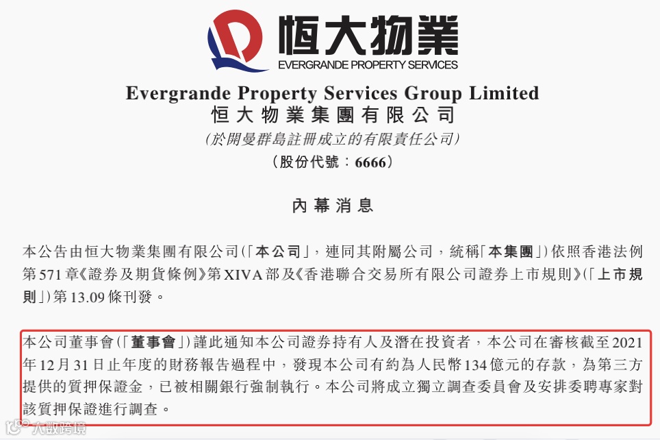 恒大物业表示,公司在审核截至2021年度的财务报告过程中,发现公司有约为134亿元的存款,为第三方提供的质押保证金,已被相关银行强制执行。恒大物业表示,将成立独立调查委员会及安排委聘专家对该质押保证进行调查。
