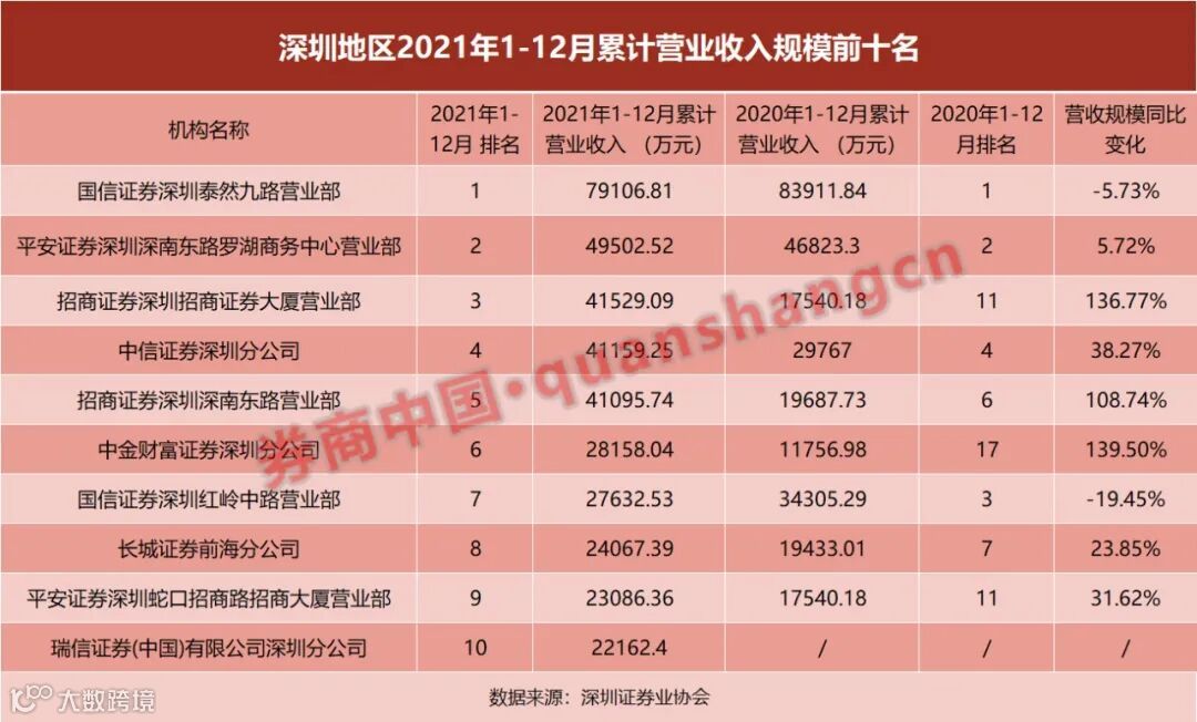 具体来看,国信证券泰然九路营业部稳坐深圳地区“宝座”,2021年营业收入和利润总额均拿下第一,分别为7.91亿元、6.13亿元。但盈利规模相比上一年度出现小幅下滑,分别减少5.73%、6.31%。