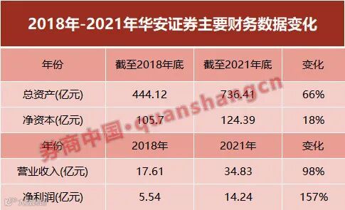 对比年报数据,杨爱民出任华安证券总经理4年来(2018年至2021年),华安证券营业收入从17.61亿元增长98%至34.83亿元;净利润则从5.54亿元增长至14.24亿元,增幅达到157%。同时得益于2020年的28亿可转债发行,2021年的39.5亿配股融资等努力,华安证券总资产也从2018年底的444.12亿元,增长66%至2021年底的736.41亿元,资本实力得到进一步壮大。