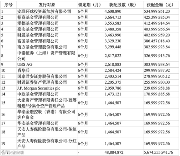 本次定增的发行对象最终确定为19家,其中包括多家头部公募机构和知名QFII/RQFII。