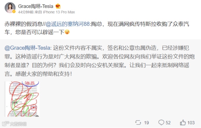 3月13日,一份盖有特斯拉(上海)有限公司公章的文件截图在互联网上疯传。文件内容显示,特斯拉正在走收购众泰汽车的流程和手续。
