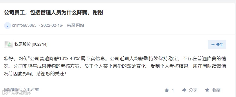 2月19日晚间,牧原股份在互动平台上公开回应降薪传闻称,公司员工不存在普遍降薪的情况。