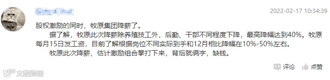 近日,有网友发帖称,“股权激励的同时,牧原集团降薪了,据了解,牧原此次降薪除养殖技工外,后勤、干部不同程度下降,最高降幅达到40%。”