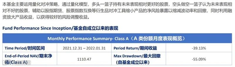 该私募于2月16日发布的一份“UBIQUANT 亚太对冲基金 2022 年 1 月 Class A 投资报告”显示,该基金1月的收益为-39.13%,产品自2019年4月成立以来的最大回撤为-55.09%。