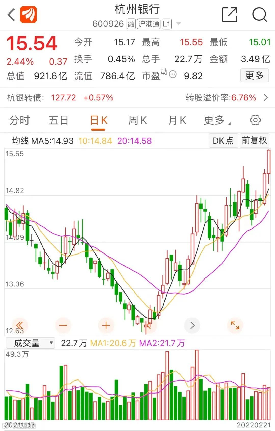 今年农历春节年后,银行板块行情向暖,多家银行股价连日上涨。截至2022年2月21日收盘,杭州银行的股价为15.54元/股,较上一日涨2.44%。